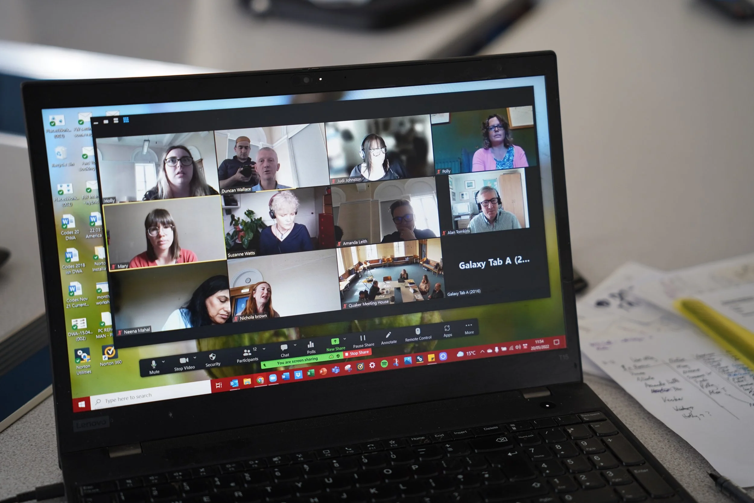 In hybrid meetings, it can be useful for those in the room, to also get their laptops out and join the online meeting space too. It means they can see the participants and the shared documentation near themselves, and their laptop camera is on them close up, as well as they can see and be seen on the wide-angle cameras.